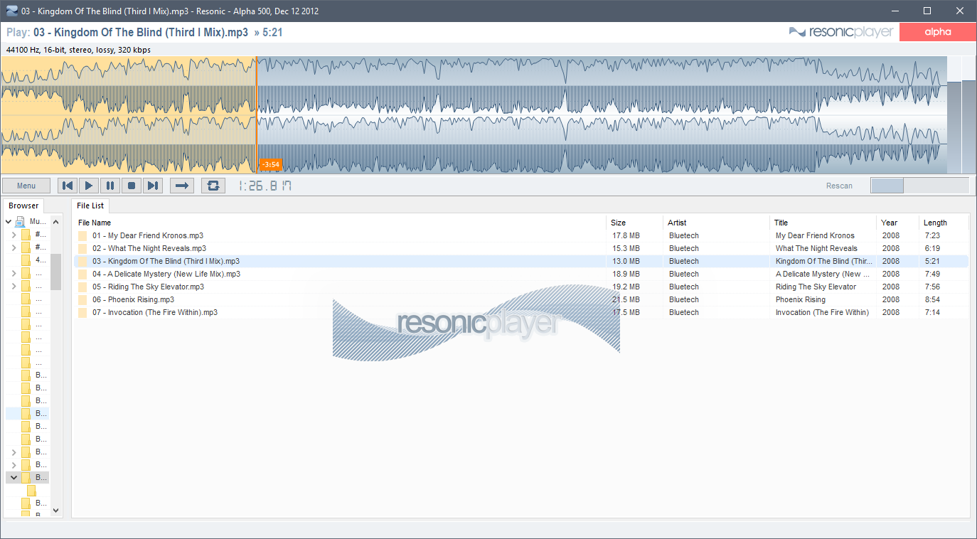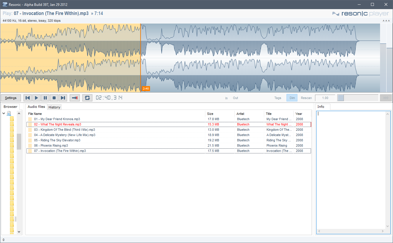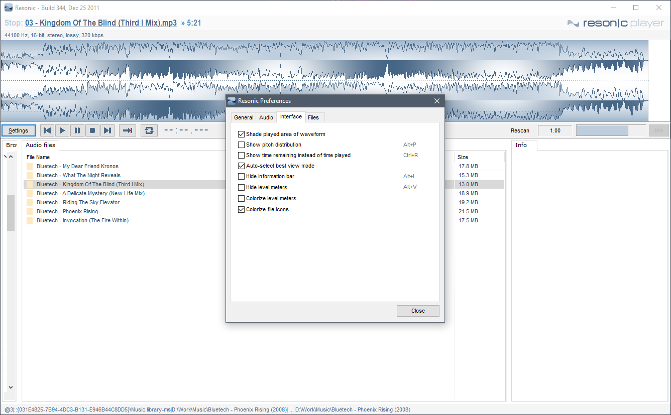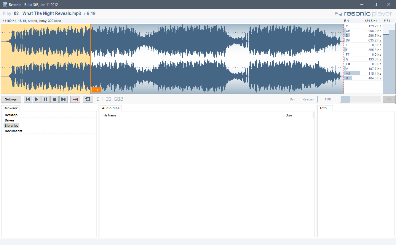Waveforms were cached into separate .rspk files on disk. No analyzers were available, many basic Windows components were used for the interface. Back then Resonic played wav, mp3, aac, ape, flac, mpc, and wma. A very simple third-party library was used to read the metadata tags.