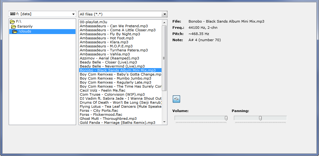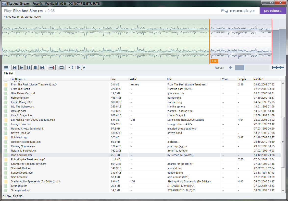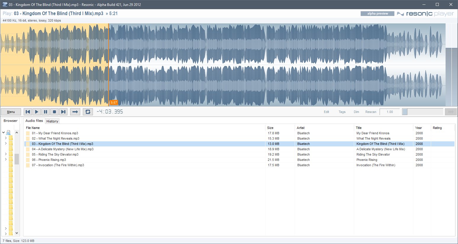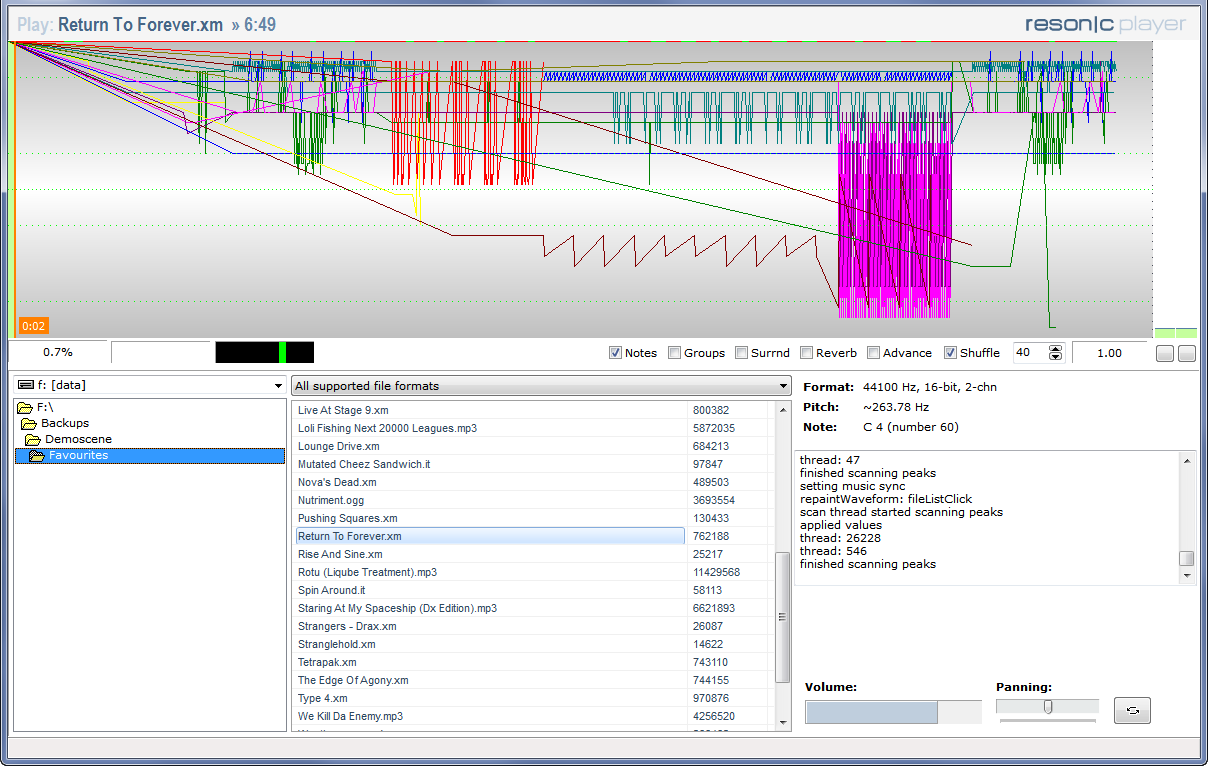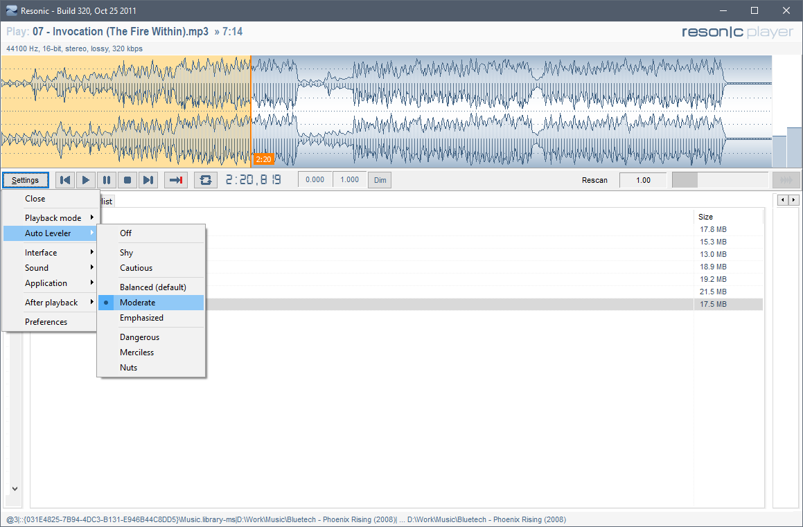 Waveforms were cached into separate .rspk files on disk. No analyzers were available, many basic Windows components were used for the interface. Back then Resonic played wav, mp3, aac, ape, flac, mpc, and wma. A very simple third-party library was used to read the metadata tags.